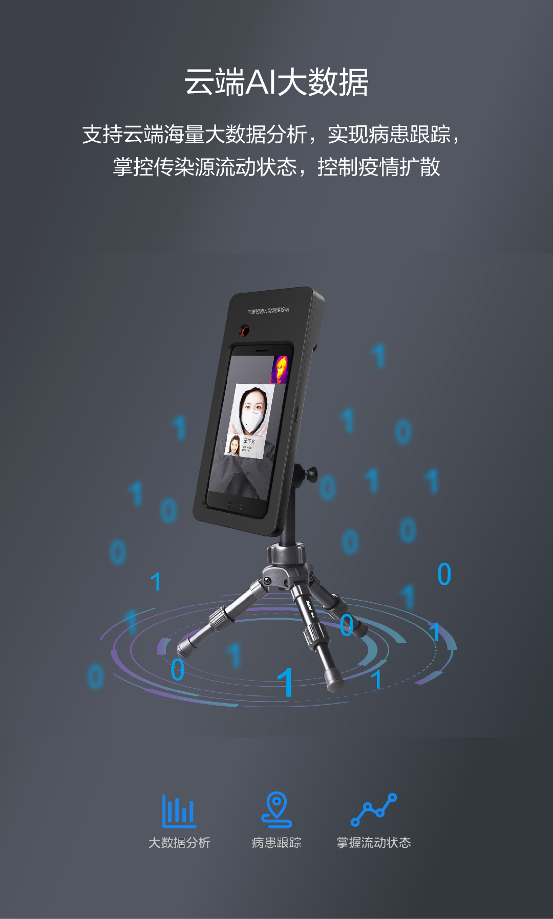 支持云端海量大数据分析,实现病患跟踪,掌控传染源流动状态,控制疫情扩散